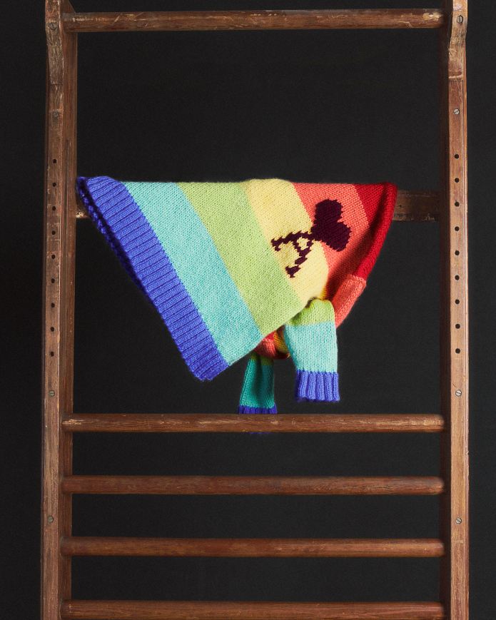 La première pièce est un pull arc-en-ciel Ami de Coeur, avec un logo Ami de Cœur brodé à la main dans un mélange d’alpaga et de laine mérinos.