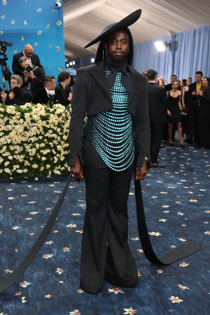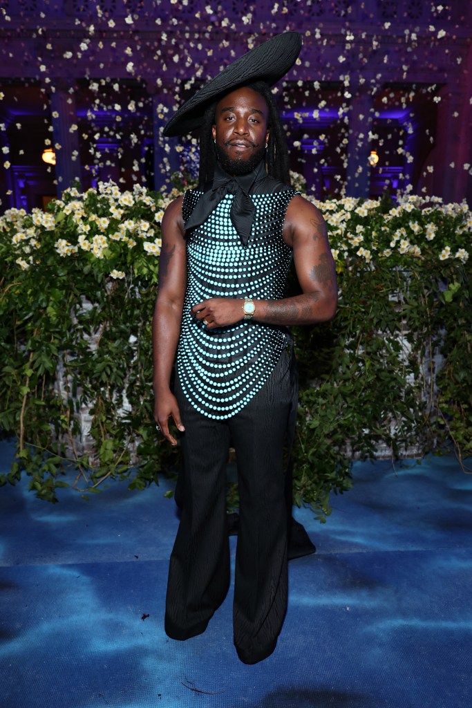 Pour la star de la musique country, son point de vue sur le thème de cette année est tout dans les détails. Shaboozey, né Collins Obinna Chibueze, a ajouté des grillades turquoise, deux anneaux et une montre, et des perles turquoises assorties sur son torse et son bas du dos.