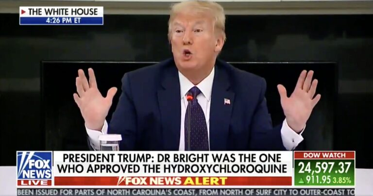 «Il se trouve que je prends. Je le prends. Hydroxychloroquine. En ce moment, oui. Il y a quelques semaines, j'ai commencé à le prendre. Parce que je pense que c'est bien, j'ai entendu beaucoup de bonnes histoires. Et si ce n'est pas bon, je ne vais pas m'en faire mal. … J'espère ne pas pouvoir le prendre bientôt. … Hé, les gens ont dit «oh peut-être qu'il est propriétaire de l'entreprise. Je ne suis pas propriétaire de l'entreprise. Je veux que les gens de cette nation se sentent bien. Je ne veux pas qu’ils soient malades. "