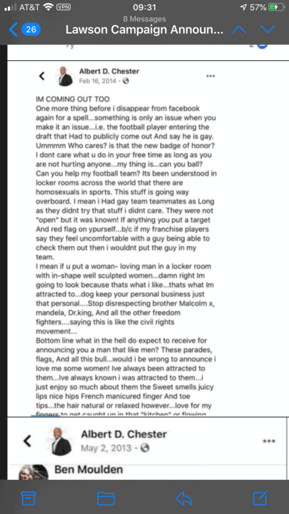 Le démocrate Albert Chester, qui défie le membre du Congrès de Floride Al Lawson lors de la primaire du 18 août, s’excuse après que des partisans aient déniché plusieurs publications répugnantes anti-gay sur les réseaux sociaux.