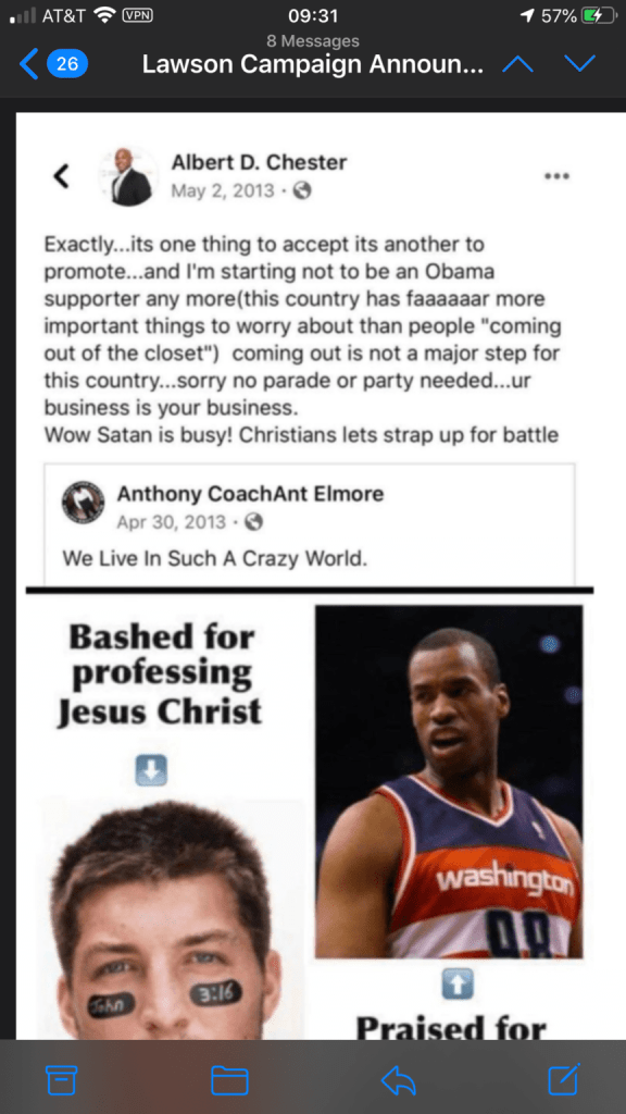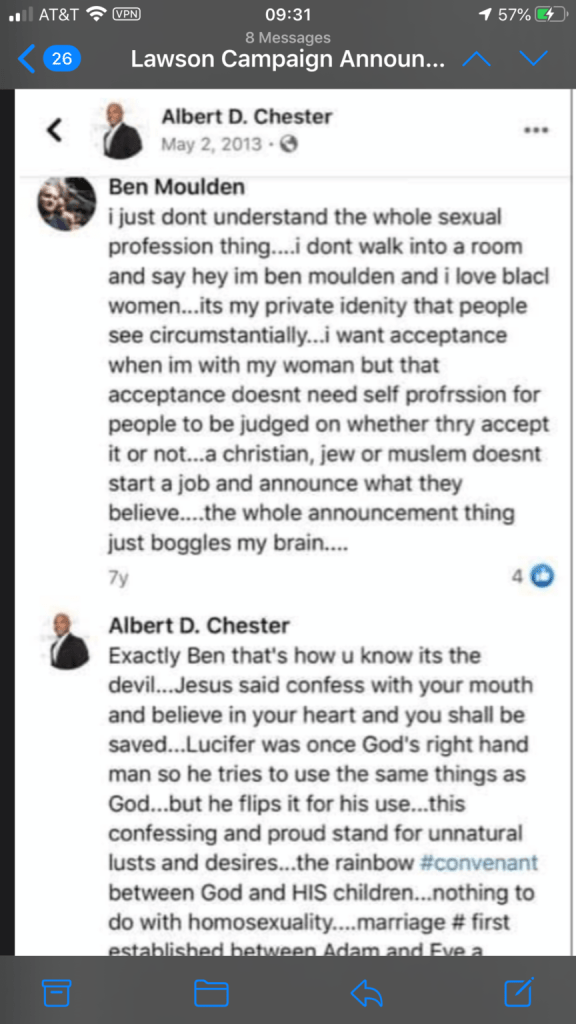 Lawson a critiqué son adversaire pour les postes: «Les commentaires homophobes et sectaires d'Albert Chester sont inacceptables. Sa rhétorique haineuse n’a pas sa place ici – pas seulement dans le cinquième district de Floride, mais dans notre pays. C'est une question de décence fondamentale. Les Américains LGBTQ sont quotidiennement confrontés à la discrimination en matière d'emploi, de logement et d'autres domaines de la vie. Ils ont besoin d'être représentés par un candidat qui se battra pour rapprocher notre nation de l'égalité pour tous, et non par un candidat préjudiciable aux progrès que nous avons réalisés. Ces déclarations publiques montrent qu’il ne comprend pas le rôle que le gouvernement fédéral doit jouer dans la création d’espaces sûrs pour nos plus vulnérables. Ce type de langage incite à la violence et divise davantage nos communautés.