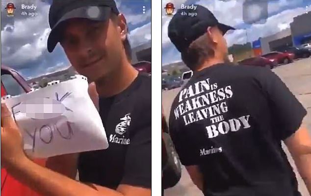 L'homme, qui a ensuite été identifié comme étant Colton Allen, 19 ans, de Bedford, dans l'Indiana, a publié la vidéo après que quelqu'un ait laissé une note sur son pare-brise en disant: «Va te faire foutre».