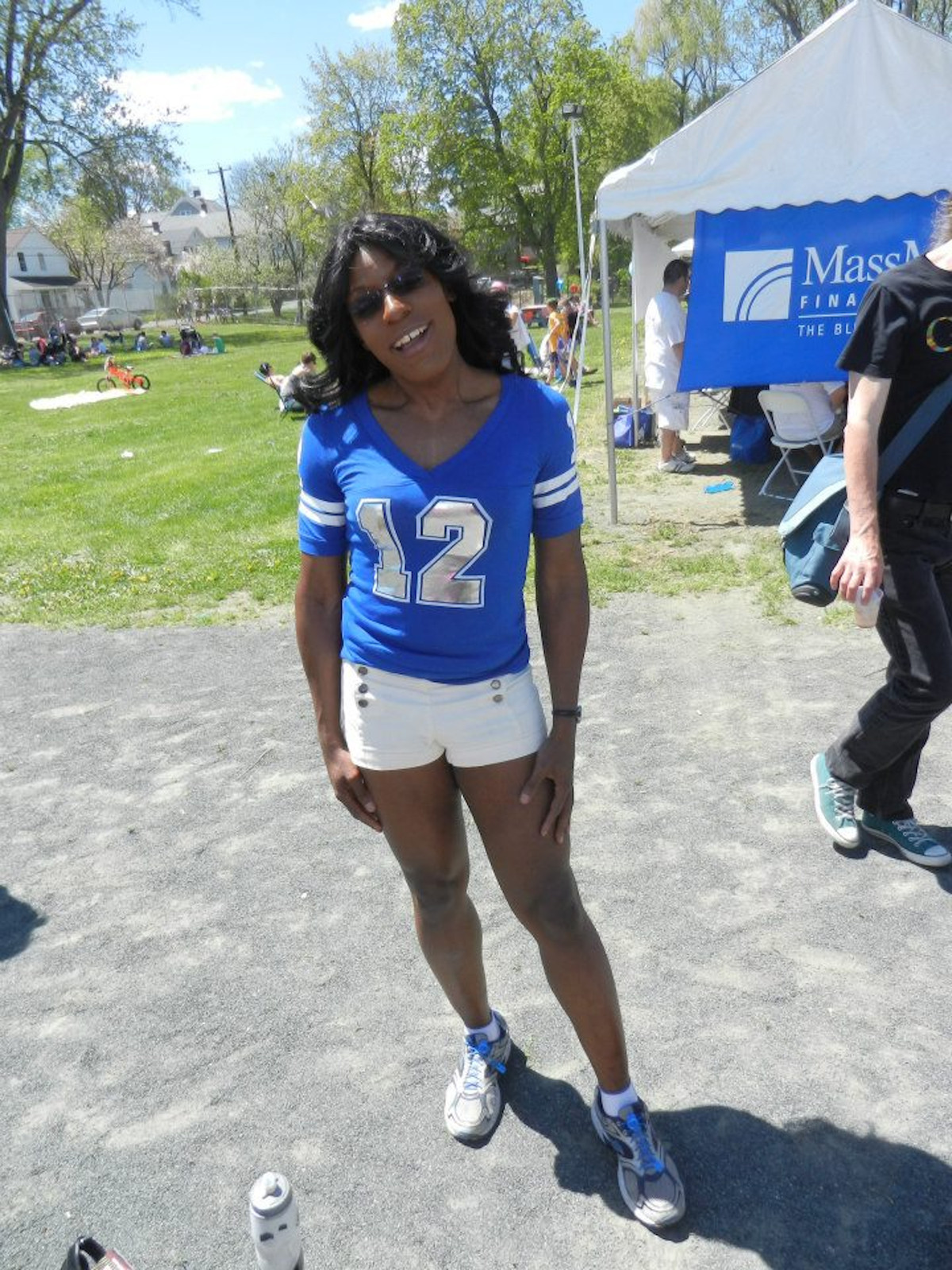 Il y avait aussi l’étincelle supplémentaire des gens qui aimaient ma tenue pour la journée : un maillot de football rose avec une bordure blanc-bleu, une jupe bleu poudré, avec des chaussettes hautes faites dans une parfaite formation de fierté trans (merci, Sock Dreams).