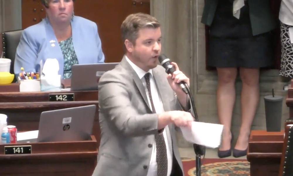 Le représentant de l’État du Missouri, Ian Mackey, a condamné son collègue républicain pour avoir poussé une législation attaquant les jeunes trans dans un discours désormais viral. (Twitter/@MOLegDems)
