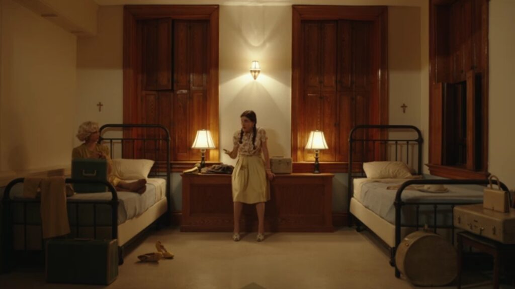 Le moment auquel Carson aspirait semble enfin se présenter. Les Peaches obtiennent de nouvelles affectations de colocataires pour leur match à l’extérieur et grâce aux intrigues et aux cajoleries intelligentes (et manipulatrices) de Carson, elle convainc certains revirements et se retrouve avec, vous l’avez deviné, Greta comme colocataire. Rebondissement : ils passent la nuit dans un couvent et on leur dit expressément qu’ils doivent se taire. Mort de rire.