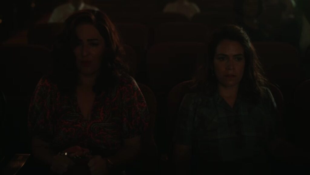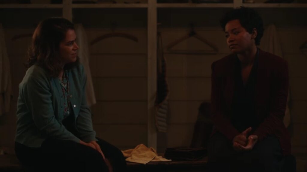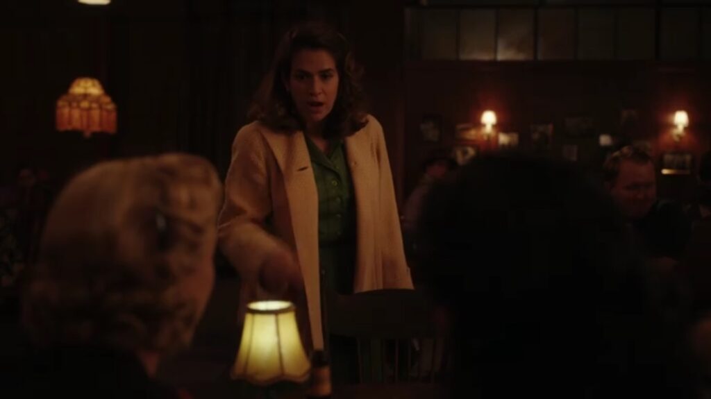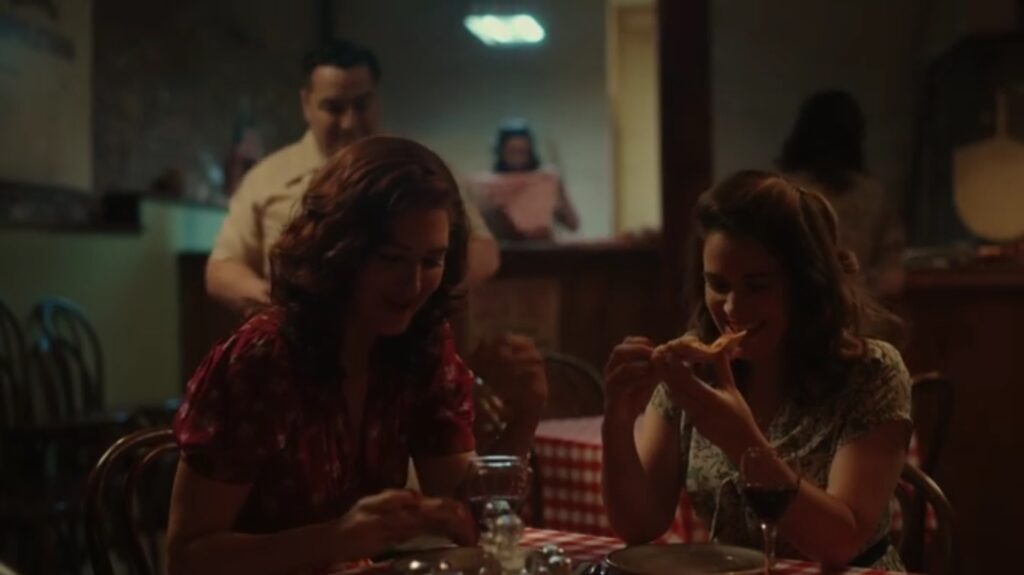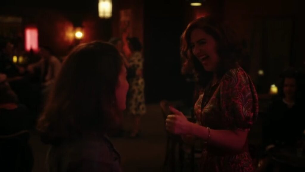 Greta emmène Carson à un rendez-vous dans un petit restaurant italien. C’est un peu exagéré quand les filles jumelles du propriétaire reconnaissent Carson du bar gay et saluent en tant que « grands fans ». Mais, nous comprenons – tout le monde est gay dans cette version de Une ligue à part, et c’est mignon si je suspends mon incrédulité. Dans un geste très doux, Greta a amené Carson ici pour lui faire découvrir la pizza et son esprit est époustouflé et c’est un petit moment de couple chéri. Carson fait un pari avec Greta : s’ils gagnent leur prochain match, Greta doit aller au bar gay avec elle.