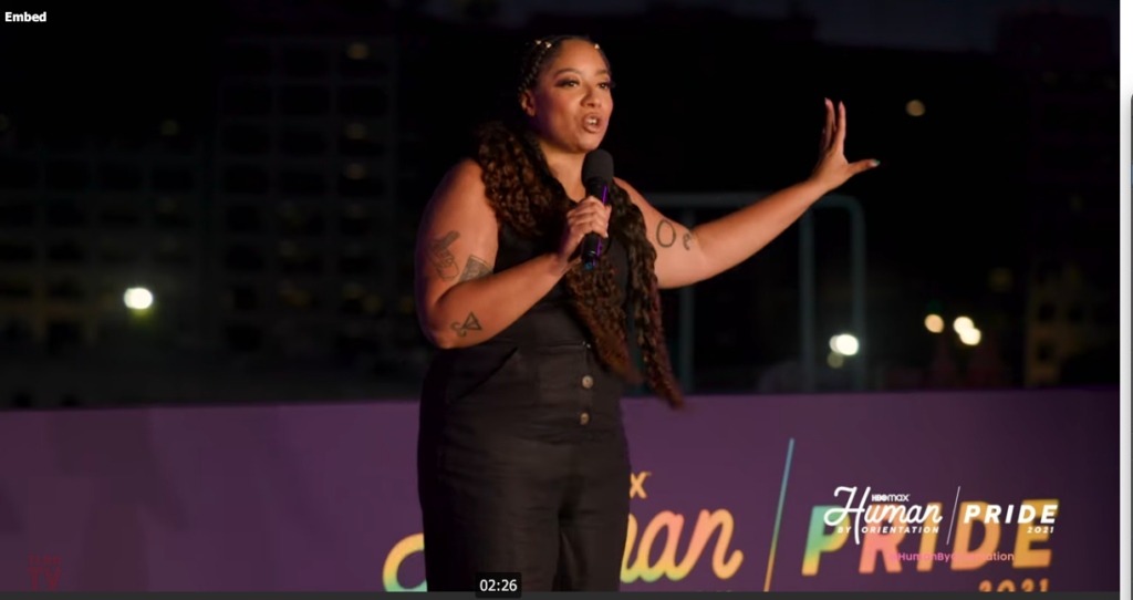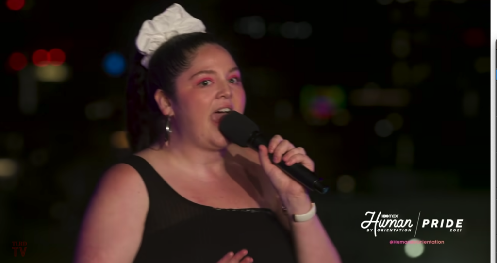 Ashley Ray dans son ensemble vivant de Human By Orientation’s Queer Comedy Showcase for Pride 2021. #HumanByOrientation
