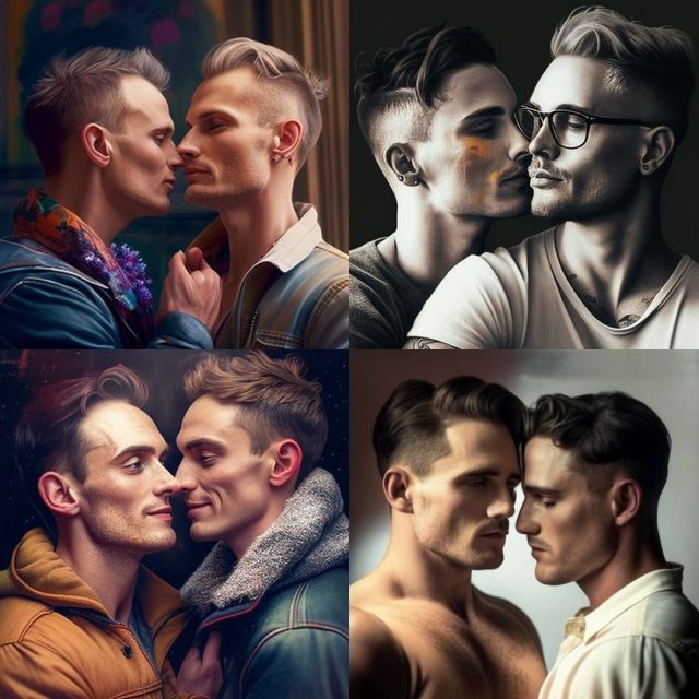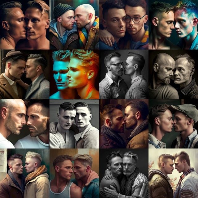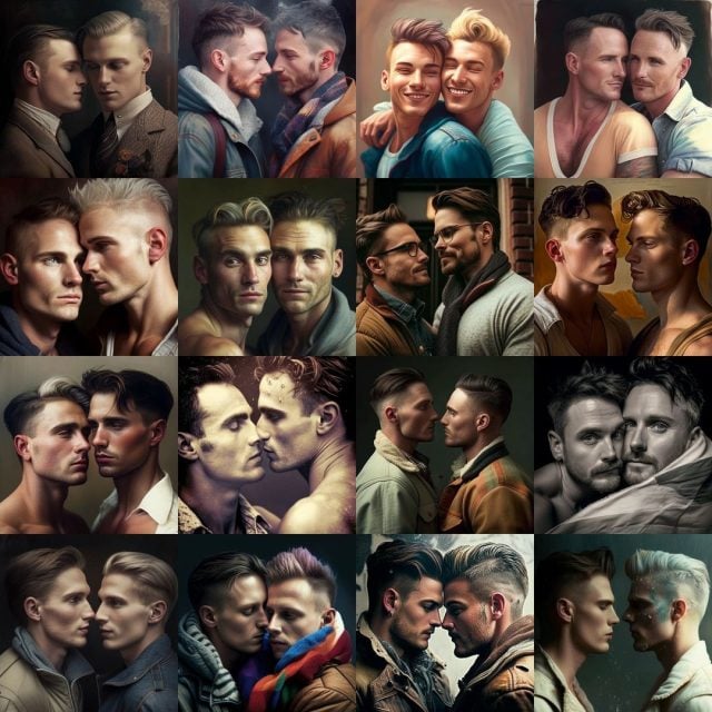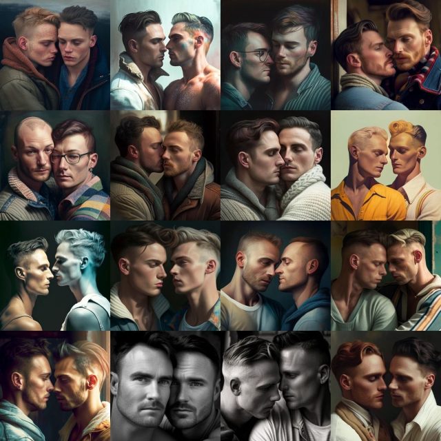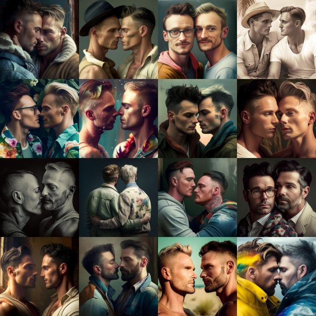 « Midjourney est l’une des technologies les plus étonnantes que j’ai jamais utilisées », a déclaré Leveille. «Mais le manque de diversité est vraiment préoccupant. 99% du temps, il s’agit par défaut des Blancs, sauf si vous l’avez spécifié. Continuez à faire défiler pour plus d’exemples d’images générées par l’invite. Considérez cela comme un rappel de la bataille difficile à laquelle sont confrontés les couples homosexuels qui ne sont pas blancs, maigres et jeunes.